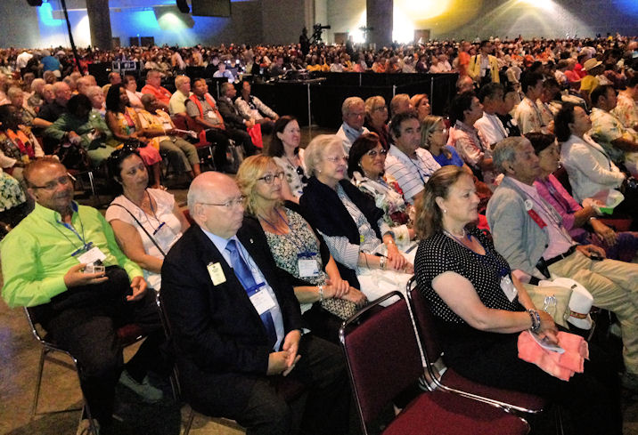 El último acto de la mañana es el desfile de las banderas de todos los países donde está presente el Leonismo, con una mención especial a un nuevo país, Santo Tomé y Príncipe, haciendo que nuestra Asociación esté presente ahora en 210 países. El cuarto día, tuvo lugar la segunda reunión plenaria, que se dedica a LCIF, lo primero fue el testimonio del profundo agradecimiento de una madre, que gracias a la revisión ocular realizada por los Leones, se detectó de forma precoz, un tumor cancerígeno en el ojo de su pequeña hija, y gracias a eso se pudo operar y salvar su vida. Su presencia con su hija en el escenario realmente nos llegó a todos al corazón y ella es testigo directo de la importancia que tiene la labor que hace nuestra fundación (LCIF) y la importancia que tiene que todos los Clubes apoyen a LCIF. El Presidente de la Fundación Barry Palmer de Australia, dio su informe, puedo destacar los siguientes ejemplos, presento dos videos, un sobre el apoyo de un colegio para niños ciegos en Filipinas, y otro proyecto de Oklahoma (EE UU), de apoyo de niños problemáticos de familias desintegradas por alcohol o droga, y está dando unos resultados muy alentadores.