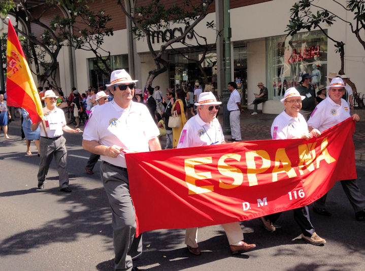 Fue grato volver, ya que en el año 2000 se celebró nuestra convención en esta isla, como todos los años el primer día se recogen las credenciales y se realizan compras en los diferentes puestos con artículos Leonísticos, además de celebrarse varios seminarios sobre diversos temas. La sorpresa fue ver un gran cartel reconociendo a los 10 clubes del mundo que más han aportado fondos a nuestra Fundación (LCIF), y apareció los nombres de mi Club Mijas y el Club de Leones Marbella Lengua Alemana, gracias a la actividad del Campeonato Mundial de Golf celebrado en la Costa del Sol, en Marzo a favor de la erradicación del Sarampión. El segundo día nuestro gran desfile, que es lo más divertido que tiene nuestra Convención, casi todos los países se visten con sus trajees típicos llenos de color y acompañados con bandas de música. Nosotros para no pasar demasiado calor, hemos cambiado nuestro uniforme de siempre, por un simpático polo blanco con nuestro emblema y la bandera española, y un sombrero blanco con la bandera de España. Las señoras como siempre con sus peinetas y mantillas, que hacen gran furor entre los asistentes, todo el mundo quiere hacerse fotos con ellas, iban todas guapísimas. Tenemos que gradecer a Pepe Castro que regaló los polos y a Loly que regaló un abanico “muy español” a cada señora. El tercer día tuvo lugar la primera sesión plenaria, que empezó con un espectáculo del musical, El Rey León. Nos dio la bienvenida el Alcalde de Honolulu que tuvo unas palabras muy halagadoras por nuestra labor como ONG, y recordó a una joven chica voluntaria de una ONG de EE UU, que fue decapitada por los salvajes Islamistas en Siria hace poco.
