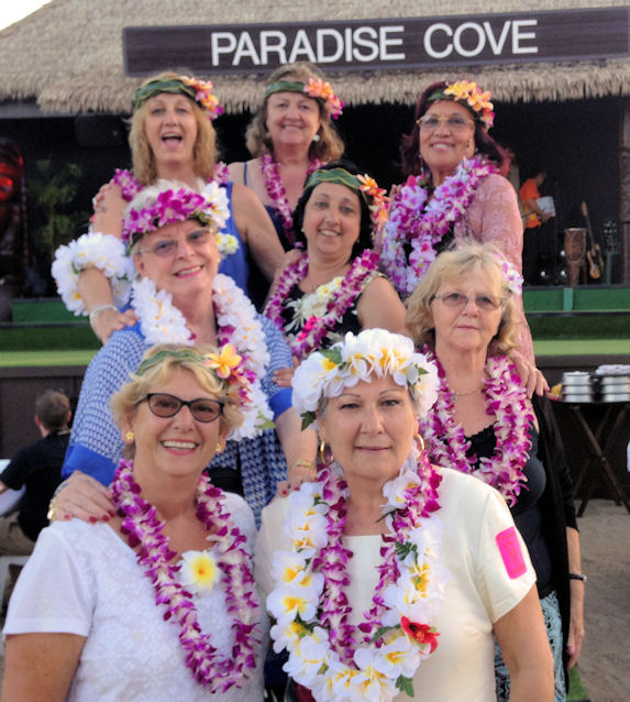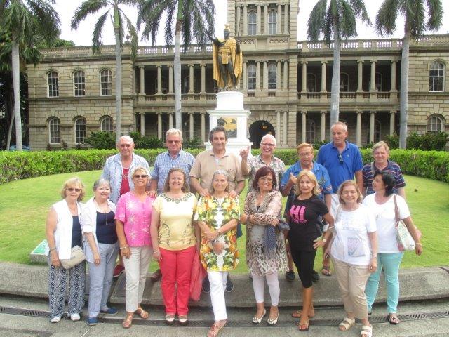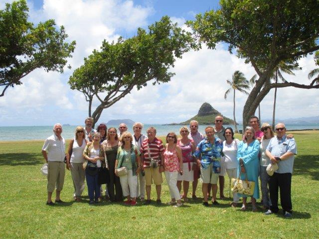 El último día, antes de empezar la convención, fuimos a un punto estratégico para ver desde lo alto toda la parte norte de la isla, la vista era esplendida. Seguidamente nos desplazamos para ver la cascada más importante de la isla, que se llega por un preciso paseo a través de un frondosísimo valle, lleno de vegetación y repleto de bellas flores, una auténtico paraíso. El paseo fue muy agradable y casi llano, para llegar al final a la cascada, se tarda unos 30 minutos andando, están tan bien organizados, que incluso tienen unos pequeños vehículos eléctricos para llevar a los inválidos. Volvimos al pueblo del primer día Hale’iwa para almorzar a una tasca típica del lugar y por la tarde fuimos al “Paradise Cove”, para ver un espectáculo hawaiana al borde del mar. Lugar encantador, con todo clase de actividades previas, incluso tenías la posibilidad de pasearte en las típicas canoas polinésicas. El espectáculo es precioso, lleno de color, música, bellas chicas y hermosos adonis, todo con una bastante buena cena-buffet y con una hermosísima puesta de sol al finalizar la noche, realmente maravilloso. Colorín Colorado, el cuento se acabó, que quieren que les diga, la próxima Convención Internacional será Fukuoka (Japón), entre los días 24 y 28 de Junio, 2016. Como os comenté en mi correo anterior, organizaré una excursión previa, tengo pensado llegar a Tokio para pasar dos o tres días ahí, y luego desplazarnos a Fukuoka, ¿quieren venir? CONVENCIÓN INTERNACIONAL DE HONOLULU