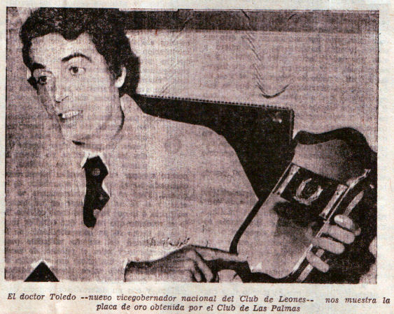 VICEGOBERNADOR NACIONAL Hoy, aún nos ha dicho el doctor Toledo, la petición de celebración de Convención Nacional en nuestra ciudad será presentada en la asamblea del Club de Leones para su ratificación. Hasta el momento don Gregorio Toledo ostentaba el cargo de presidente del Club de Leones de Las Palmas, en el que cesa ahora para ocupar el de vicegobernador nacional a petición del gobernador electo. --En todas las convenciones nacionales -prosigue el doctor Toledo-, cada club lleva su embajadora. En esta ocasión fue mi esposa representando al Club de Las Palmas y sobre ella ha recaído el título de Embajadora Nacional. Doña Nelsy Chelala, luciendo con elegancia el traje típico de la tierra, ha conseguido para nuestra provincia un nuevo galardón, motivo por el cual desde aquí la felicitamos. --En el concurso de la Federación de Club de Leones de España, Las Palmas obtuvo la placa de oro, valiosa distinción que desde ahora tendremos aquí. Pero no todo acaba, puesto que Canarias en general -y nos referimos a su Club de Leones ha sido la gran "Vedette" de esta convención, nacional, con una nueva distinción se trajo para Las Palmas. --Se nos otorgó un premio sin precedentes dentro del leonismo español, concedido a Canarias por considerar que los clubs de esta región han sido los que mejor trabajaron. Consistió en un diploma en el que figuran los clubs de Leones de toda la región que han sido distinguidos. Para el