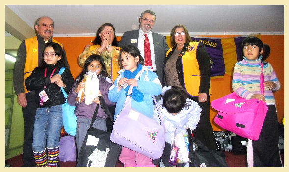 El colegio está situado en una zona de pescadores pobres que perdieron todo, incluyendo sus casas y barcos, todo regalado fue donado por los Leones de Uruguay con una donación de 3,000 $. Además de esto, es digno mencionar que con la ayuda de LCIF, los Leones de Chile han construido un asilo de ancianos por un valor superior a los 180,000 $. La mañana siguiente salimos temprano de Concepción para dirigirnos a Los Ángeles, lugar donde tuvo lugar la convención, y desde ahí fuimos directamente la provincia de Alto Bio Bio, conocido por ser las últimas regiones de Chile donde llegaron los misioneros, parece mentira que fue hace solamente 40 años que los indígenas vivían aun en la edad de piedra. En el poblado de Ralco fuimos recibidos por el Alcalde indígena y nos atendió muy efusivamente, se le entregó varios paquetes de pañales para adultos y niños, luego el personalmente nos enseño las diferentes dependencias del ayuntamiento.