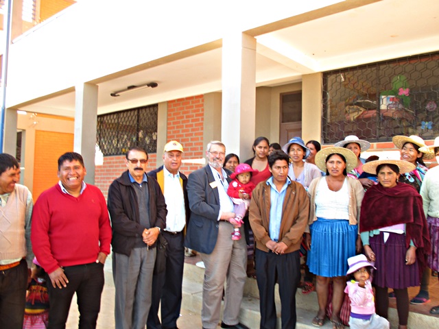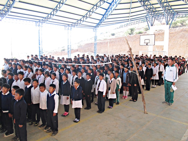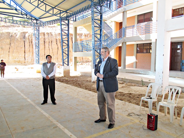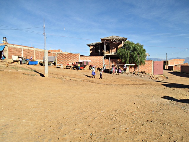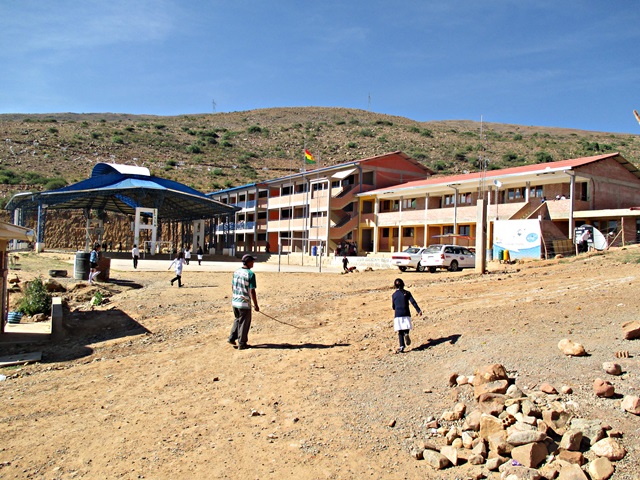 Llegué tarde y fui directamente a la cama, a la mañana siguiente me vinieron a buscar temprano, para llevarme a la población de Sacaba, al sur de Cochabamba. Fuimos a un suburbio de recién creación, hace unos 6 años empezaron a desplazar la población aquí, entre otras razones, los terrenos son más baratos, aquí visitamos la “Unidad Educativa Nuevo Amanecer”. La edificación original del colegio, fue construida por los lugareños, pero luego el gobierno en diferentes fases han construido dos bloques de aulas que están bastante bien, y esperan construir una tercera, ya que la población está creciendo rápidamente. Actualmente hay 777 niños en este colegio, para una población de unas 200 familias, por cierto aquí no hay control de natalidad. Aunque las edificaciones son modernas y buenas, están prácticamente vacías, los profesores no tienen mesas, no hay estanterías y no tienen ordenadores, de hecho me han pedido 20. Incluso los alumnos no tenían mesas, tenían que estar sentados en sillas de plástico, solamente hace unos pocos meses han recibido mesas y sillas nuevas, después de varios años solicitando este material. Después de inspeccionar la escuela, todos los alumnos se pusieron en formación en el patio del colegio y cantaron el himno de Bolivia y diferentes alumnos dieron mensajes de bienvenida. Seguidamente nos dieron una especie de caldo de arroz, papas y carne de bienvenida.