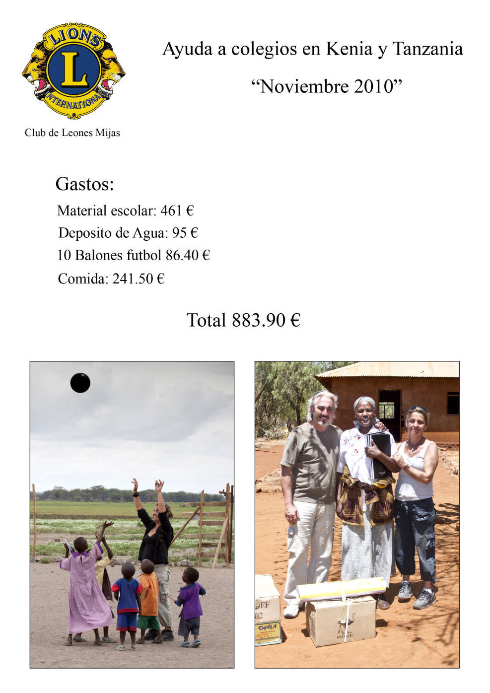 JESÚS JAIME EN KENIA Y TANZANIA Como Leones creo que nuestro deber es hacer el bien por los demás, esta obligación moral es el espíritu de todos nosotros en este época del año, debemos pensar de qué forma podemos ayudar a los que más necesidades tienen en nuestra comunidad. De hecho creo que todos los clubes hacemos una labor positiva en esta época del año. Mi club, como muchos otros, entrega cestas de navidad, además de otras cosas. Pero en mi club tenemos la suerte de tener al fotógrafo Jesús Jaime y como todos los años hace un viaje a tierras exóticas para hacer fotos, y siempre aprovecha sus viajes para hacer el bien, y ayudar a los menos afortunados. Pues acaba de volver, y permítanme felicitaros en estas fiestas, con esta muestra de ayuda de mi Club a los más desafortunados. Jesús y su esposa Charo, viajó esta vez a Kenia y Tanzania, durante este viaje se dedicó hacer fotos de animales, y ha realizado unas fotos maravillosas de elefantes y Leones. Aprovechó el viaje para visitar el orfanato que reconstruimos hace 6 años, y otros lugares que había ido en viajes anteriores. También, visitó el orfanato en el cual compramos una nevera industrial hace unos meses. La ayuda fue entregada a Colegios en Kenia y Tanzania, durante el mes de Noviembre 2010. La ayuda fue: -