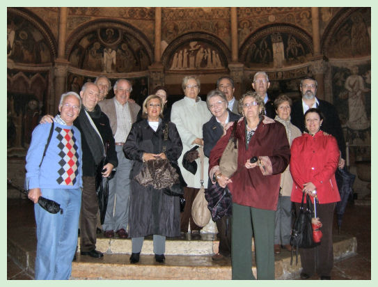 Estuvo el Consejo de Gobernadores al completo, la Presidenta Mª Rosa Compte y los Gobernadores Esperanza Pelegrín y José Manuel García con su esposa Ana. Además del distrito 116-A vinieron tres Asesores del Consejo Arturo Carrio y su esposa Ana, Miguel Ángel Fernández con su esposa Sol y Pedro Bellón. Del distrito 116-B, el Asesor de Intercambio Juvenil Cristóbal Herrero con su esposa Carmen, los presidentes de los Clubes Castillo Tenerife, Francisco José Guilarte con su esposa Teresa, Marbella Francófono Stella Clausmeier y San Miguel de la Palma, Nicolás Hernández, el vice Gobernador José Castro, el pasado Gobernador inmediato Pol Navarre con su esposa Viviane, el Secretario de nuestro Distrito José Perucho, que además asistió a un seminario de liderazgo antes del Forum, mi esposa Loly y yo. Antes del Forum, la mayoría de nosotros hicimos unas pequeñas excursiones para visitar algunas ciudades monumentales cercanas a Bolonia. El primer día fuimos a Módena y Parma, ambas ciudades tenían unas catedrales realmente espectaculares. Tuvimos la suerte de que la hija de Arturo estudió en Parma, y conocía un simpático restaurante en el centro de la ciudad, comimos muy bien. El día siguiente visitamos a Ferrara visitando su castillo, catedral y su famoso baptisterio, almorzando en un restaurante típico con más de 500 años de historia y por la tarde nos acercamos a Mántova, visitando el famoso Palacio del Te. Que contiene unos espectaculares frescos, realmente increíbles.