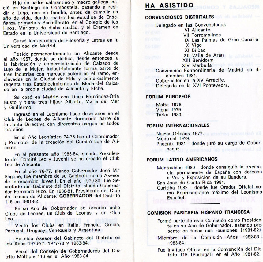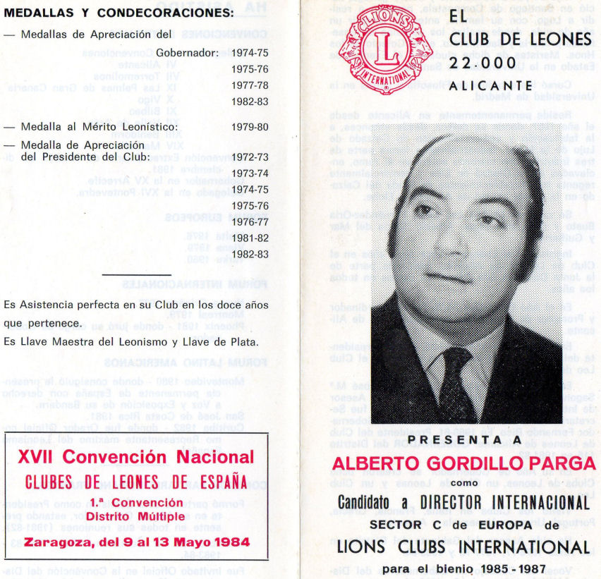 XVII Convención Nacional. Presidida por Juan Fernández Peinado como Presidente del Consejo de Gobernadores, se celebró en Zaragoza a continuación de las Primeras Convenciones de Distrito de los Distritos 116 A y B, del 10 al 12 de Mayo de 1984. La triste pérdida que conmovió al Leonismo Español del Gobernador Electo del Distrito 116 A, José López Fernández, antes de entrar en funciones, hizo que fuera nombrado Gobernador del D 116 A, a propuesta de las autoridades Leonísticas Españolas y mediante ratificación de Lions Clubs International, Pablo Villabona Carapeto. De manera que las Primeras Convenciones de Subdistritos fueron presididas por Pablo Villabona, Gobernador del D 116 A, y Juan Topham Wilpret, Gobernador del D 116 B. En el Distrito 116 A se aprobó la creación de un Premio Leonístico a la eficacia administrativa : "Reconocimiento Leonística José López". En el Distrito Múltiple se aprueban las modificaciones a los Estatutos sobre el respaldo de la Candidatura a Director Internacional que sólo será válido para dos Convenciones Internacionales sucesivas. Asimismo se aprueba la creación de un fichero en el Distrito Múltiple para que sea efectiva la no readmisión en ningún Club del Distrito Múltiple de un socio expulsado justificadamente de su Club. Hubo dos candidatos a Director Internacional, Carlos Hernández, del Club de Leones Las Palmas y Alberto Gordillo del Club de Leones Alicante 22.000, saliendo elegido para el periodo 1985/87 el compañero Carlos Hernández. En las primeras Convenciones de Subdistritos fueron elegidos gobernadores de los Distritos 116 A y B respectivamente, para 1984/85, Felipe Navarro Padilla del Club de Leones de Benidorm y Manuel Márquez Campos del Club de Leones de Torremolinos.