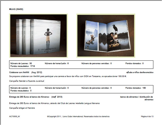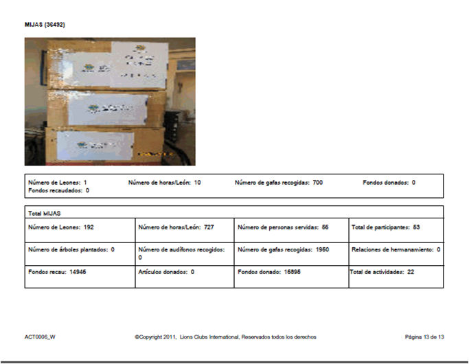 Aquí en este punto vais a ver una pestaña que dice Año Leonístico, y actualmente se pueden descargar los últimos tres años. En el caso de mi Club, este año salen 13 hojas en un PDF, que se puede guardar en la computadora, imprimir o reenviar a los socios del Club para que estén informados. Aquí tienes un ejemplo, el informe incluye fotos y todos los datos introducidos, al hacer el informe de actividades.