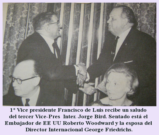 128º El Pres. Inter. Claude M- De Vorss estuvo en Madrid para discutir la función del Leonismo en la vida de España, con altos miembros del Gobierno y para oficializar la presentación de la ceremonia de la entrega de la Carta Constitutiva. Estuvo acompañado por el tercer Vice-Pres. Inter. Jorge Bird. Pres. De Vorss y Vice-Pres. Bird, se reunieron con el “Premier” Francisco Franco y miembros de su gabinete. Estuvieron acompañados por el embajador de EE UU en España Robert Woodward. Durante las discusiones, el Pres. Inter. De Vorss presentó al Generalísimo la medalla Leonístico Jefe de Estado. España es el segundo país grande en hacerse país miembro de Lions Internacional en los últimos años. Primera en 1963, fue Turquía con el establecimiento del Club de Estambul. Aunque España tiene un territorio más pequeño (Un poco más grande que california) que Turquía, tiene una población mayor. El presidente del new Club es Juan Abello Pascual, un diputado. Su señas es Paseo de Moret 9, Madrid. THE LIONS, edición inglesa de marzo 1965 TWO COUNTRIES OF LIONISM