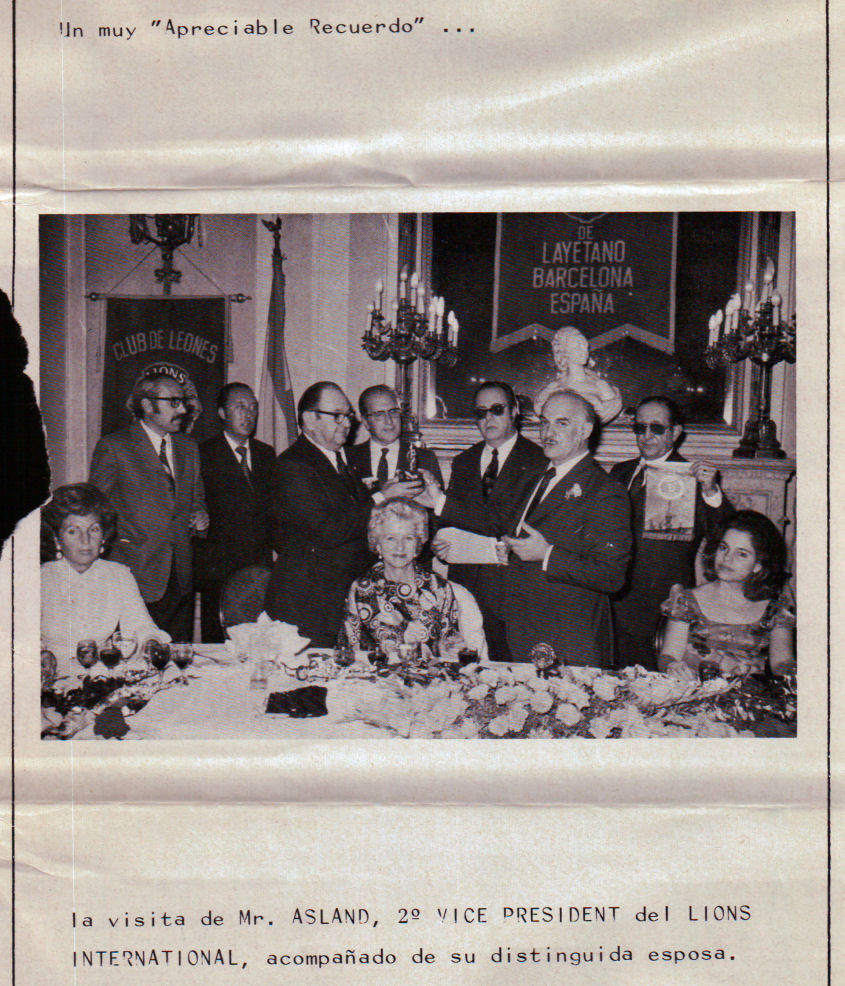 DEL VICE PRESIDENTE 2º INTERNACIONAL Según el Boletín Nº 13 del Club de Leones Barcelona, de Noviembre 1973, página 2 ... dice lo siguiente. Participación en la recepción y cena organizada por los clubes de la 2ª región en el Hotel Ritz, para recibir al Vice presidente de Lions Internacional, Mr. Asland, en su visita a nuestra ciudad. SEGÚN ENRIQUE GARCÍA MELÓN - "Creo recordar que Aslan estuvo en Las Palmas, en el año de Juan Andrés Melián. Te adjunto un foto en la que saluda a damas de nuestro Club. La de rosa es la esposa de Ripollés (entonces Presidente), la de azul la mía (yo era Asesor del Gabinete), la de rojo pertenecía también al Club de Santa Cruz. Con Aslan está de pie Juan Andrés Melián, Gobernador al que reconocerás."