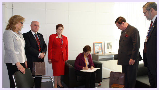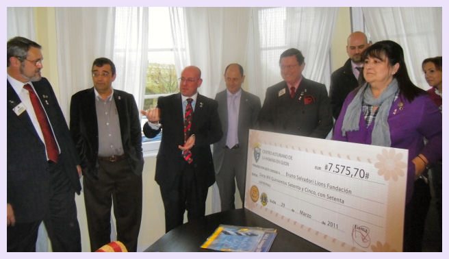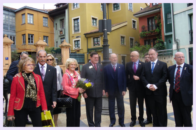 Seguidamente nos fuimos a visitar a la vicepresidente del principado de Asturias, María José Ramos Rubiera, donde también se mantuvo una larga conversación, el presidente Internacional le entregó una medalla de nuestra Asociación por la colaboración tenida con el Club de Leones de Gijón. Volvimos a Gijón, para cerrar el congreso, donde nuestro presidente tuvo su intervención más importante ante los congresistas. Una vez terminada, salimos hacia Oviedo, donde nos recibió el Club de Oviedo con su Alcalde Gabino de Lorenzó al frente, almorzamos con los socios y se le entregó un reconocimiento al alcalde y se le impuso la insignia a un socio nuevo. El alcalde insistió en darnos un pequeño paseo por el centro histórico, terminando ante el catedral, para después seguir hacia Gijón, para visitar “La casa de la Vida”, creada por la Bruno Salvadori Lions Fundación para mujeres afectadas con cáncer de mama. Tuvo un emotivo encuentro con ellas y el presidente Internacional hizo la entrega de un cheque de 7.575.70 Euros a la fundación, dinero conseguido por los torneos deportivos organizados por el Club de Leones Gijón, justo esa misma semana.