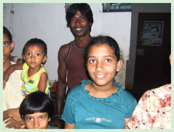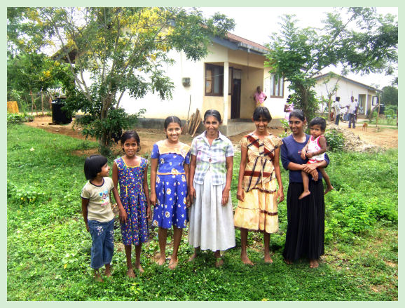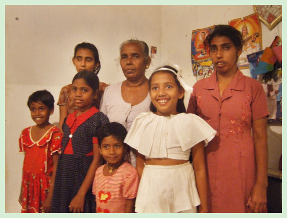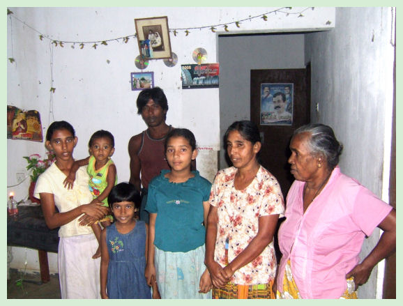 Cuando visité la casa estaba la chica con discapacitada mental, no fuimos capaces de comunicarnos con ella de una forma coherente. Por la noche volví a la casa para conseguir una foto de toda la familia, que habían vuelto del colegio y trabajos, pero no me acordaba de completar los datos de las edades y profesión anterior del padre de la familia. Una de las hijas, formaba parte del coro de niños que cantaron cuando llegue. El jardín estaba bien cuidado con plantas de verduras y frutas. Segunda visita realizada entre el 9 y 11 de Diciembre del año 2009 Ahora viven 12 personas en la casa, dos de ellas se han casado, y una tiene una niña de un año y siete meses. La que tiene la niña es la que tiene aspecto de discapacitada, pero la vi mejor y con una cara de felicidad grande, se ve que le ha sentado bien ser madre. Me entregan una carta solicitando una de las casas vacías. Soy de la opinión de que necesitan otra casa, y se lo merecen. He sugerido a los Leones de Sri Lanka. ID Luis Domínguez Calderón