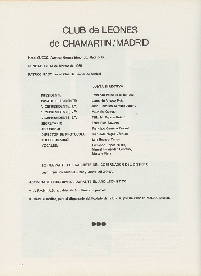 Club de Leones Chamartín Madrid fundado el 07/02/1968 Eventos y actividades más importantes realizados por el Club