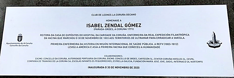 Esta estatua monumento en honor de ISABEL ZENDAL GÓMEZ se ha inaugurado el 30 de noviembre de 2.020, coincidiendo con el 217 aniversario de la salida de la Real Expedición Filantrópica de la Vacuna. El Club de Leones La Coruña Decano, ha hecho el mismo día de la inauguración, la entrega de una reproducción de la estatua a cada uno de los benefactores e instituciones que ayudaron a conseguir la culminación de éste proyecto. Hubo unas palabras de reconocimiento y recuerdo a nuestro querido e inolvidable C. L. Arturo Carrio Biempica Q.E.P.D. y se hizo entrega de una estatuilla a su viuda y C.L. Ana María Liébana Vázquez. Lógicamente hay mucha historia y detalles de ésta actividad que nos llevaría unos cuantos folios más. Un fuerte abrazo