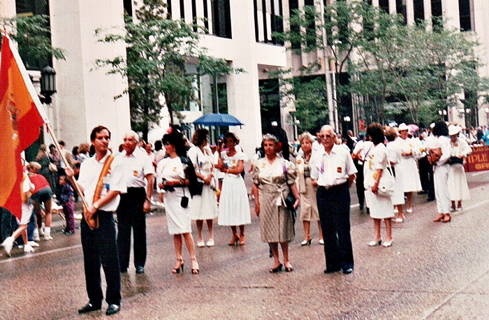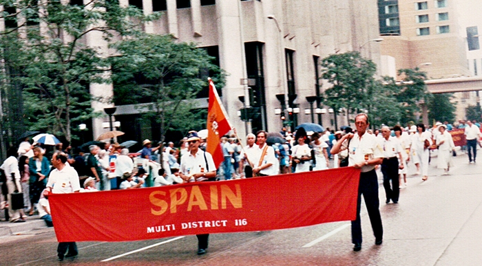 Por la noche los Gobernadores Electos asistieron a la cena en su honor como cierre del Seminario y yo cené acompañado de Nelson Vidal y señora, Ex Gobernador de Perú. En la mañana del martes 12, se celebraron la mayoría de los Seminarios programados en la Convención, todos ellos sin traducción al castellano. Mientras tuvimos una nueva reunión de trabajo, junto a Gloria Mho, Gerente del Departamento iberoamericano los tres ponentes en el Seminario de Extensión y Socios, los Ex Gobernadores Solari de Uruguay y Vidal de Perú y yo mismo por España. De esta forma conocimos el material que cede uno de nosotros pare posteriormente trasladarnos a la sala prevista, donde comprobamos el funcionamiento de la megafonía y proyector de dispositivas, hasta que se incorporó el Ex Director Internacional de Argentina Dr. Luis Murad que actuaría como moderador. Terminado el Seminario de Extensión y Socios, del que se hace una reseña en este mismo periódico, y almorzar en el mismo recinto de la Convención con el Gobernador saliente Eutimio Rodríguez, fuimos a prepararnos pare el desfile que se inició a las 6,30 de la tarde, pare evitar las horas de mayor calor de la mañana, terminando cerca de las diez de la noche. España, que ocupó el lugar 112 en la parada, inició el desfile cerca de las nueve, cuando todavía el asfalto se quejaba del terrible calor que había soportado durante el día. Contamos con una delegación compuesta por 22 participantes, con la llegada de compañeros de Alicante, Madrid, Tenerife y Torremolinos.
